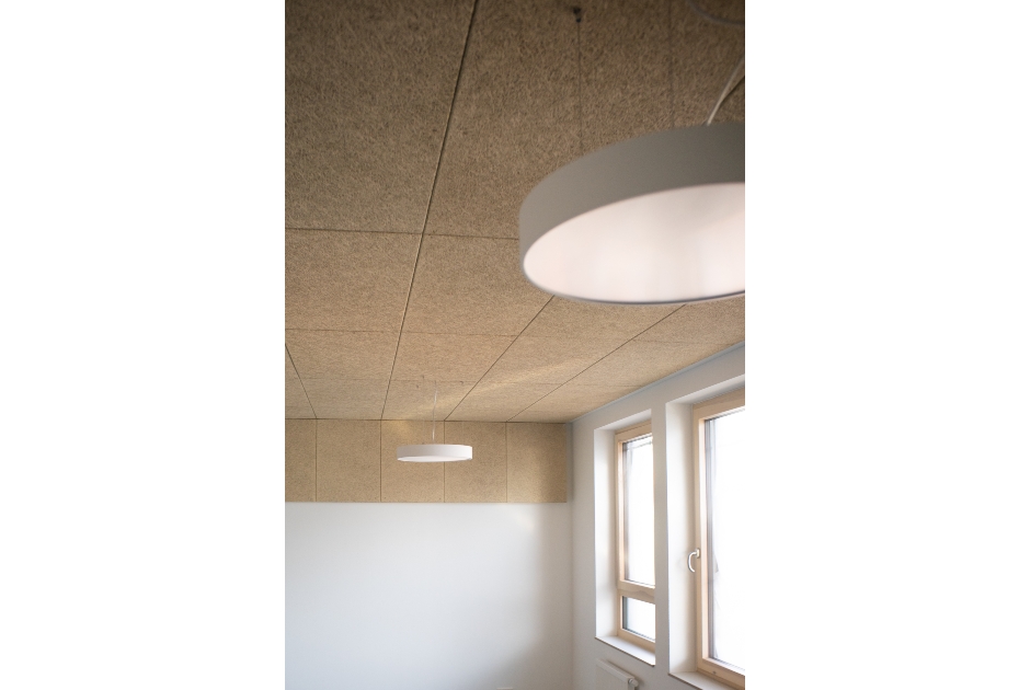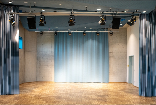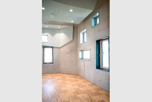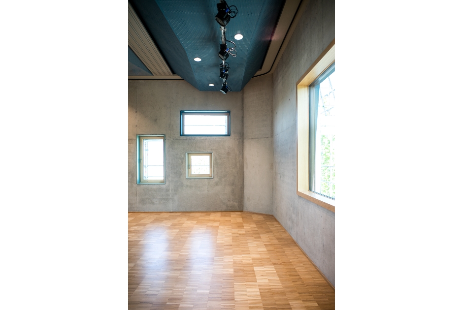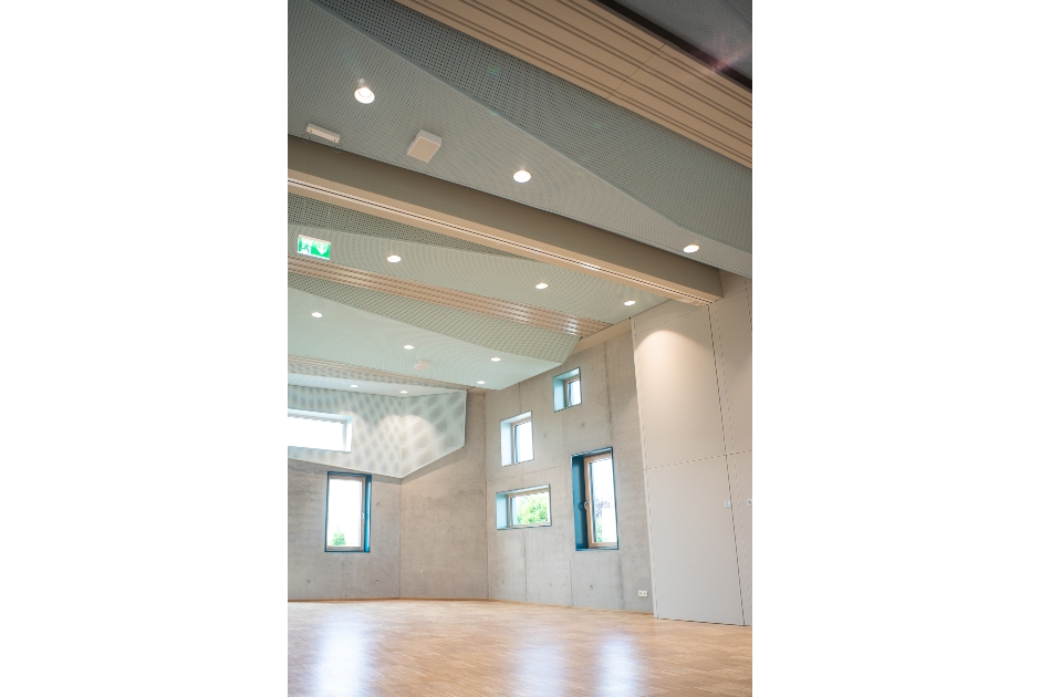 Im Obergeschoss ragt der höhere Gebäudekörper des mehrfach nutzbaren Festsaals wie ein Schiffsbug in die Landschaft. In ihm verbinden sich Technik, Beheizung und Akustikmaßnahmen zu einer sinnlich skulptural gefalteten Deckenlandschaft, im Farbverlauf des Himmels. An den vieleckigen Kuben bricht sich das durch die unterschiedlich großen Fensteröffnungen scheinenden Lichts, auf immer wieder neue Art und Weise.