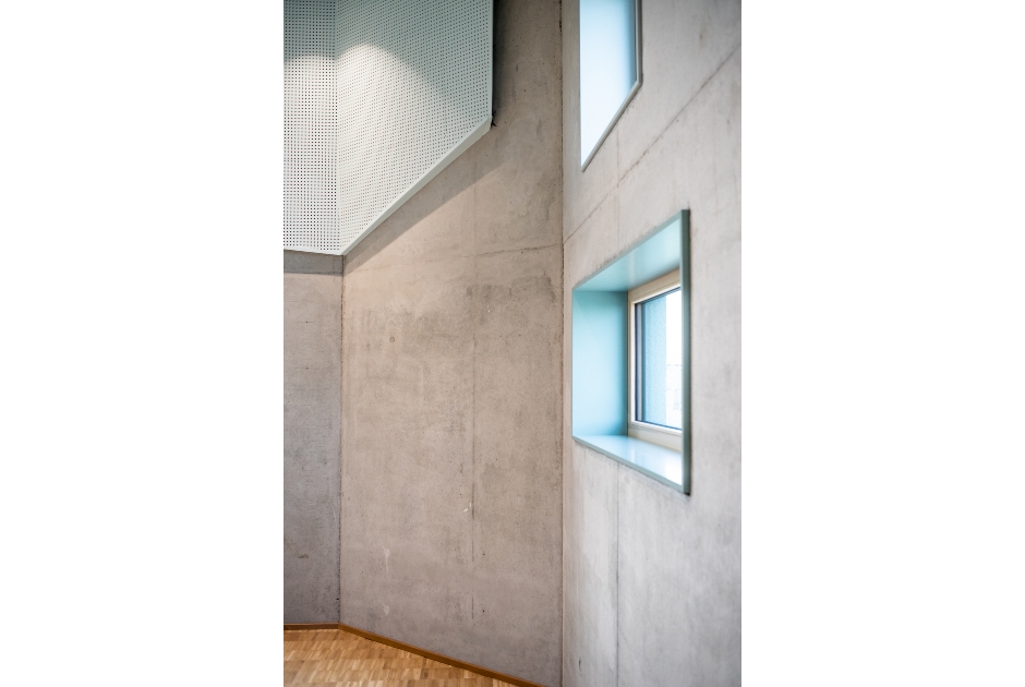 Ruhig und rein auf sich selbst bezogen steht die monolithische Schulerweiterung in einer inhomogenen Umgebung, eingekeilt zwischen städtischem Recyclinghof, Altenheim und Kleingewerbeflächen. Sie trotzt mit ihrer ganz eigenen Sprache allen Trends und Modeerscheinungen.