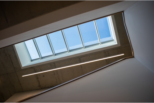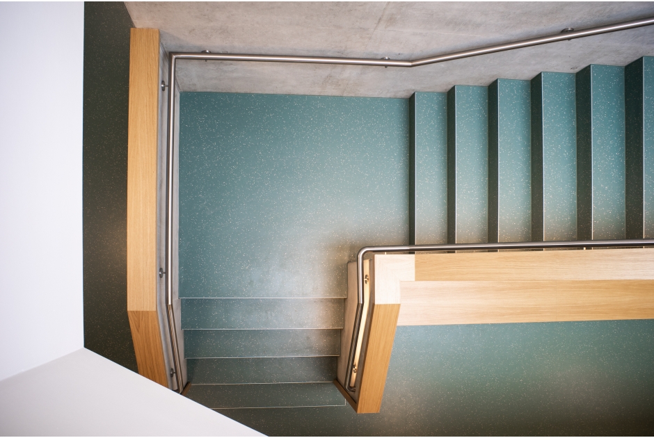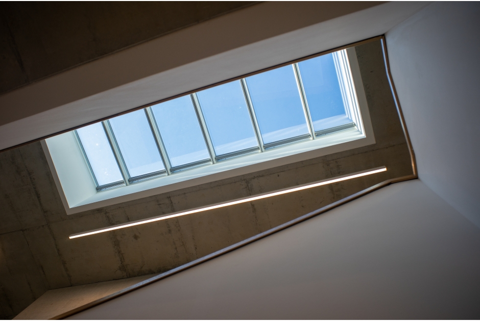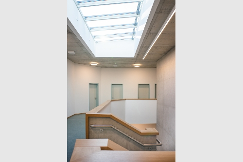 Ein großes Oberlicht sorgt für ein lichtdurchflutetes Treppenatrium und hellen freundlichen Fluren.