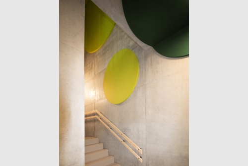 Neben zwei Gruppenräumen ist im Erdgeschoss die zentrale, zur Zubereitung aller Kindergartenmahlzeiten des Ortes ausreichende, Regenerationsküche mit angeschlossenem Essraum untergebracht. Der angrenzende Mehrzweckraum kann mit mobilen Tischen und Stühlen als zusätzlicher Essraum genutzt werden und ist für Feste oder Veranstaltungen mit dem Essraum zu einer größeren Veranstaltungsfläche zusammenschaltbar. Im Obergeschoss sind neben dem Personalraum vier weitere Gruppenräume untergebracht. Der Gartenzugang aus den beiden Geschossen erfolgt direkt über eine Außentreppenanlage.