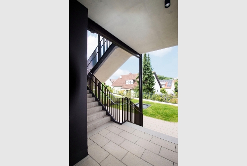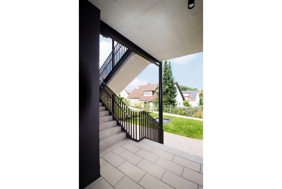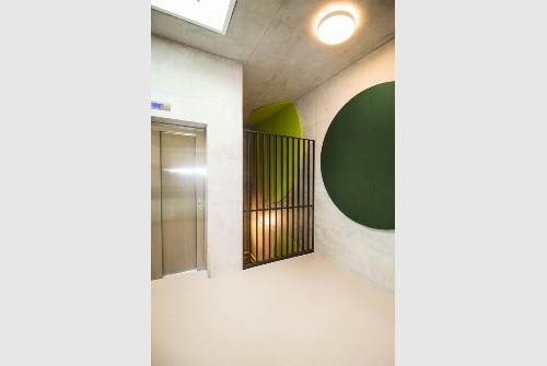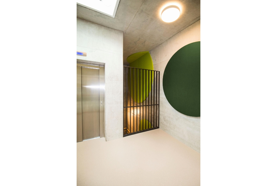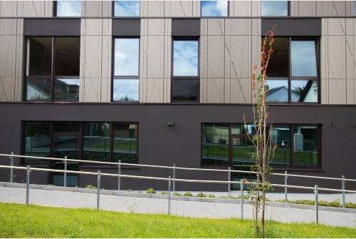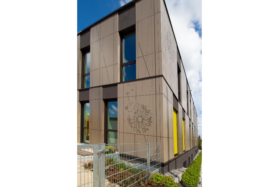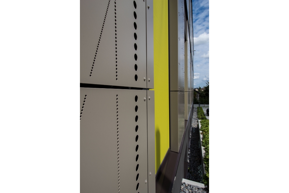 Die horizontal gegliederte Lochfassade schafft mit zwei unterschiedlich farbigen Aluminiumfassadentafeln und ruhigen Putzflächen Bezug zur umliegenden kleinteiligeren Bebauung. Durchgängig über die Tafeln verlaufende perforierte Lochbänderungen fügen die Fassade wie mit einem Band zu einem Ganzen zusammen.