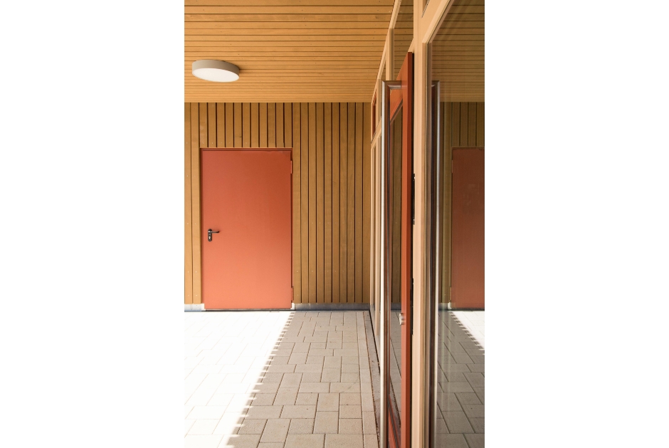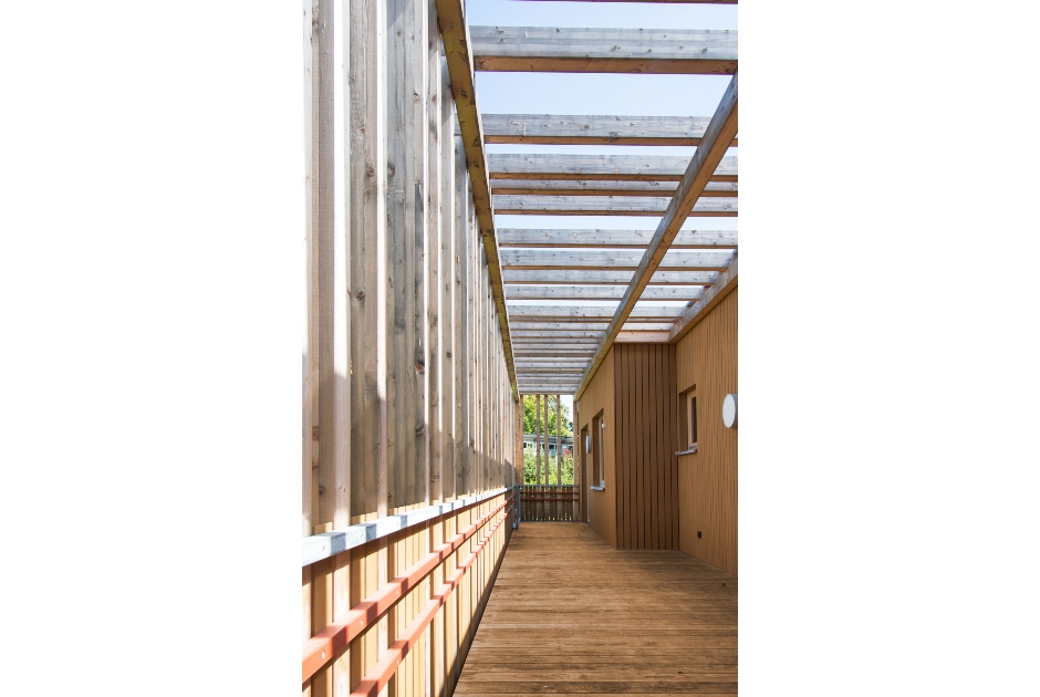 Vor den Gruppenräumen liegt eine Pergola, über die die Kinder die Außenspielfläche direkt erschließen können.