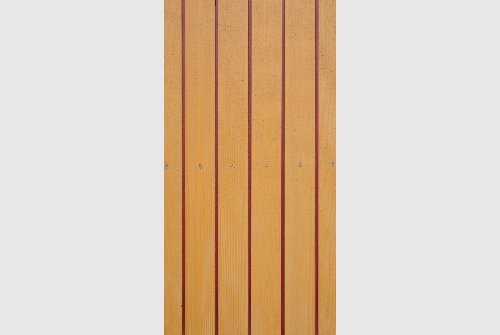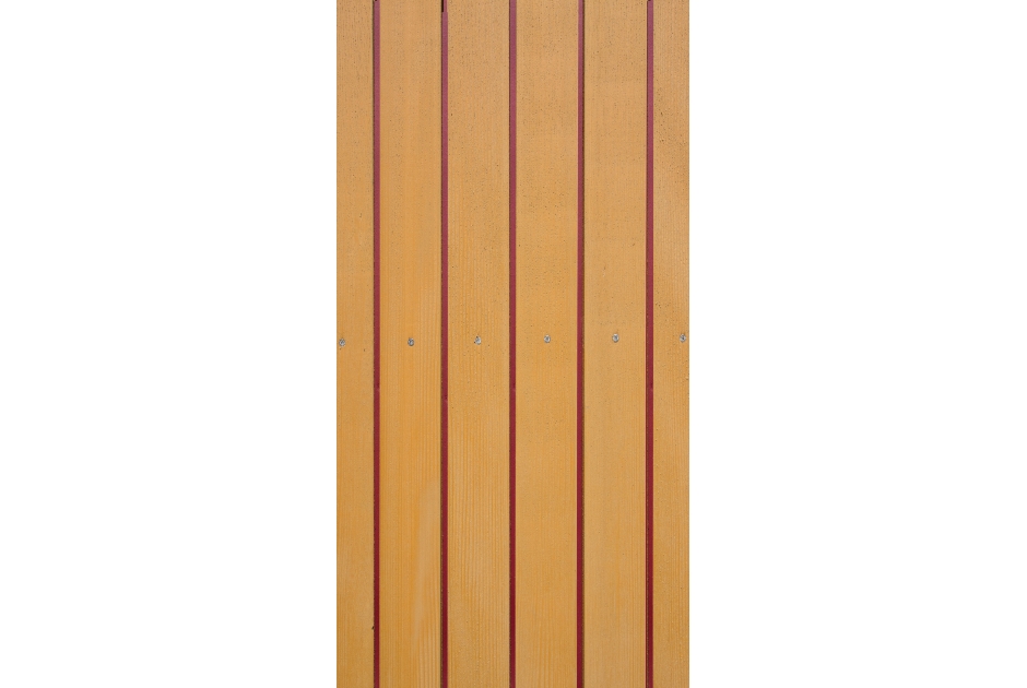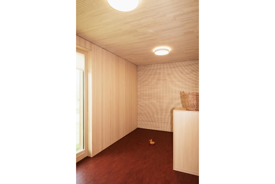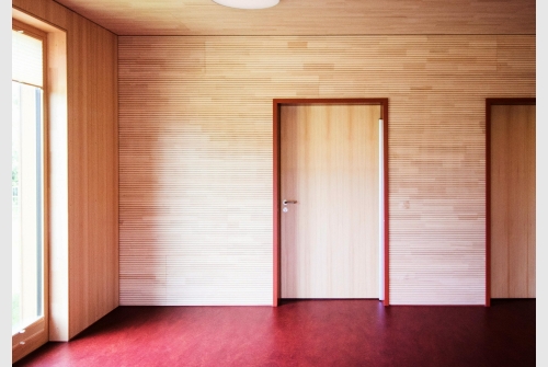 Die Holzverschalung außen wird im Innenraum mit einer Weißtannenverkleidung der Wände und einer Holz- Akustikdecke fortgeführt. Der warme Rotbraunton der Böden schafft einen angenehmen Kontrast.