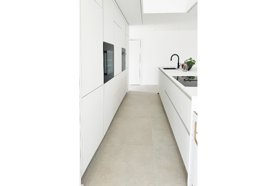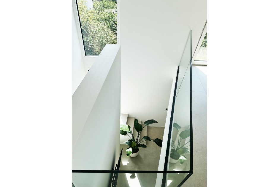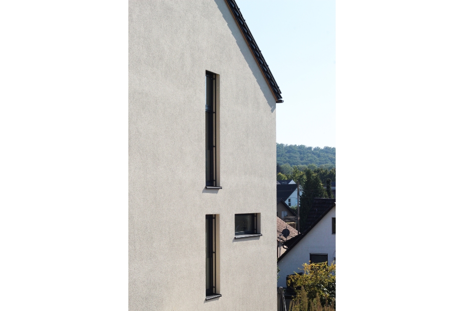 Von der Straße aus wird das Gebäude im Erdgeschoss erschlossen. Die Diele öffnet sich in einen großzügigen offenen Ess- und Küchenbereich mit weitem Blick ins Tal. Über eine in die offene Galerie am Essbereich eingestellte L- förmige Treppe, wird das Wohnzimmer mit direktem Gartenzugang im Untergeschoss erschlossen. Eine gerade einläufige Treppe hinter dem frei in den Essbereich eingestellten Küchenblock führt ins Obergeschoss. Dort öffnet sich der Dachraum bis zu der Dachschräge. Große Dachflächenfenster lassen das Dachgeschoss hell und licht erscheinen. Sie bringen über den offenen Luftraum über dem Küchenblock zusätzliches Licht ins Erdgeschoss. Um den Luftraum ordnen sich im Dachgeschoss zwei Kinderzimmer, das Elternschlafzimmer mit Ankleide und ein Familienbad mit separatem WC an.