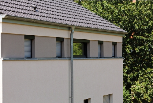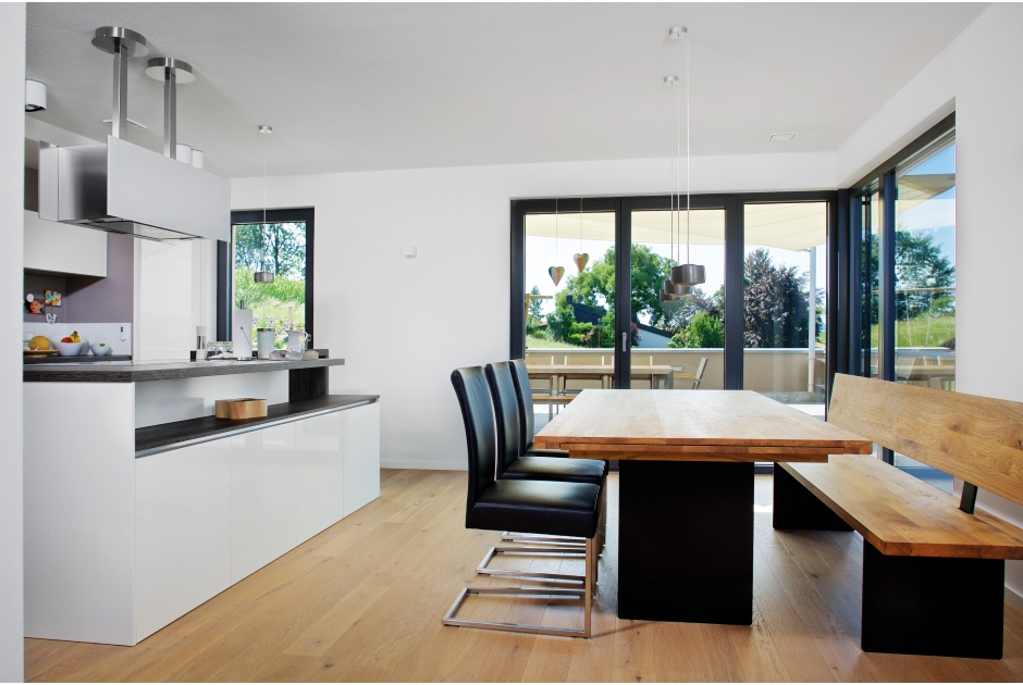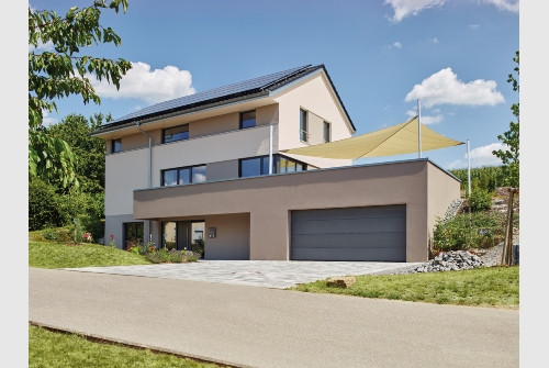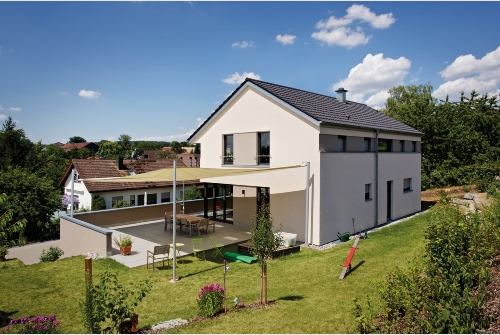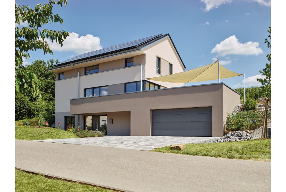 Das über die Gebäudeabmessungen überstehende Untergeschoss markiert von der Straße her den Eingangsbereich und bietet ausreichend Platz für eine vielfältig nutzbare ebenerdige Terrasse im darüber liegenden offenen Wohn-/Essgeschoss.